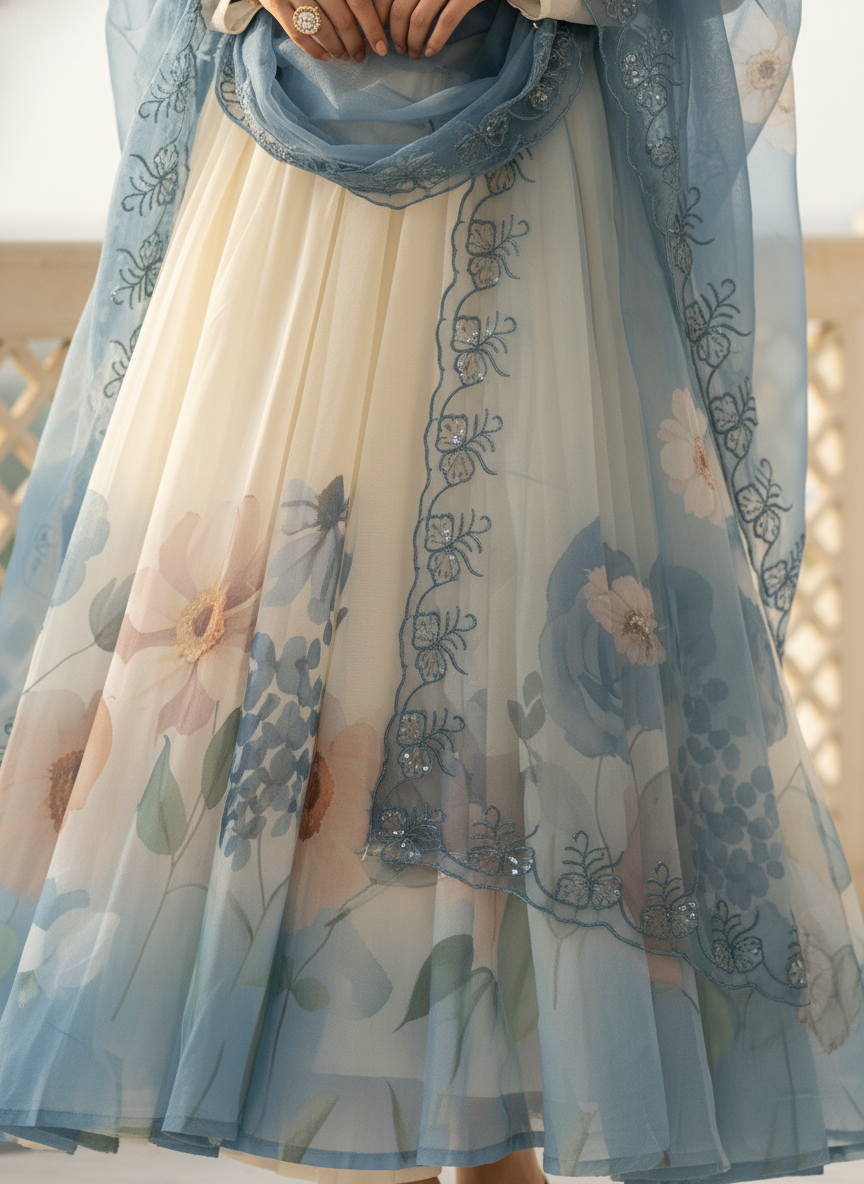 Floral Chiffon Gher Kurti Set - Blue